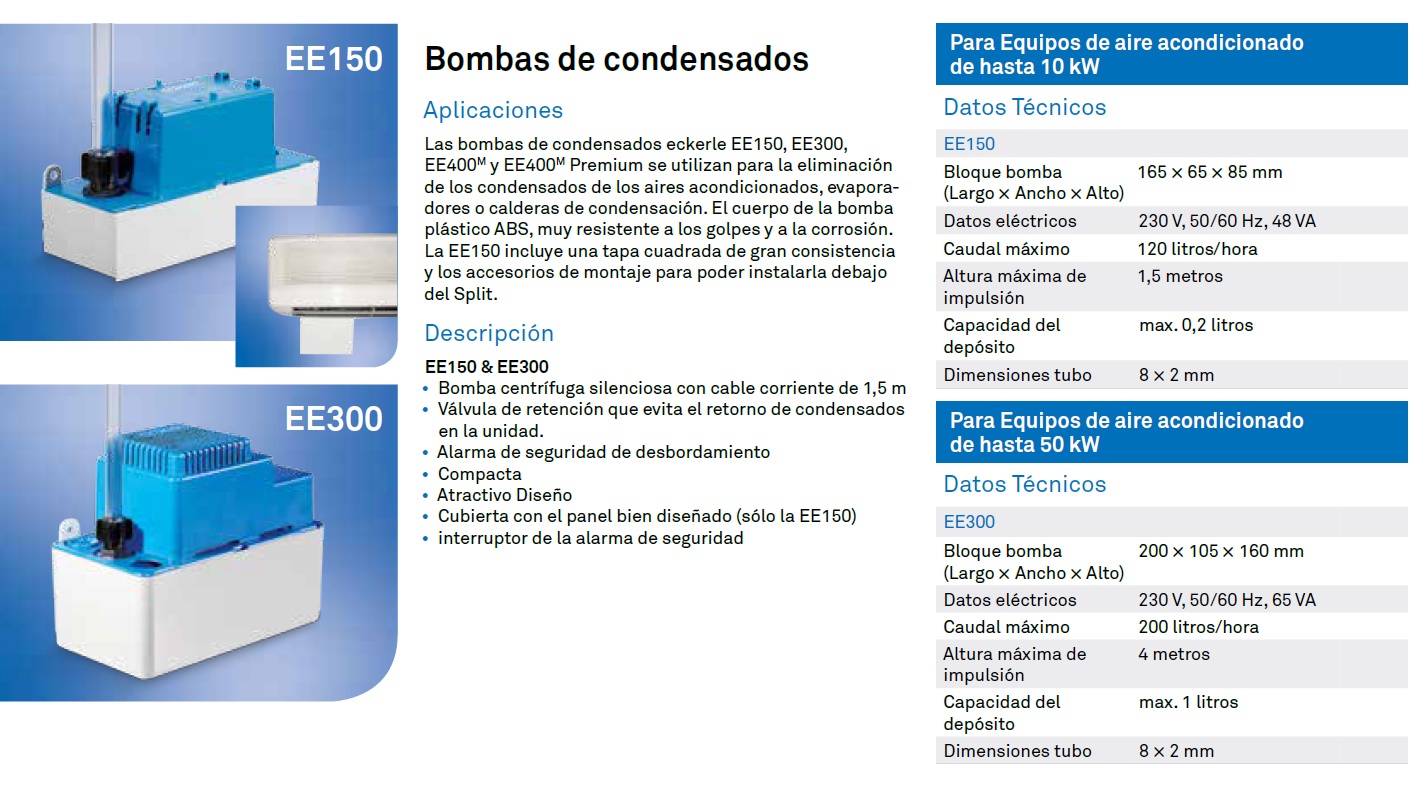 Las bombas de condensados eckerle EE150 se utilizan para la eliminación de los condensados de los aires acondicionados, evaporadores o calderas de condensación. El cuerpo de la bomba plástico ABS, muy resistente a