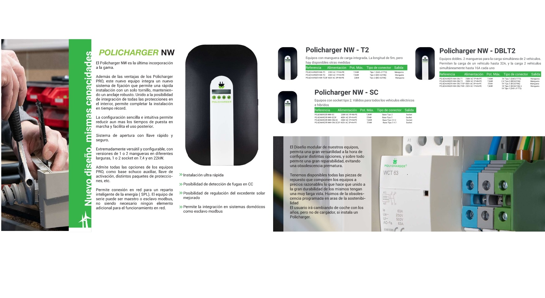 Extremadamente versátil y configurable. Con versiones de 1 o 2 mangueras, en diferentes larguras; 1 o 2 sockets en 7,4Kw y 22Kw.