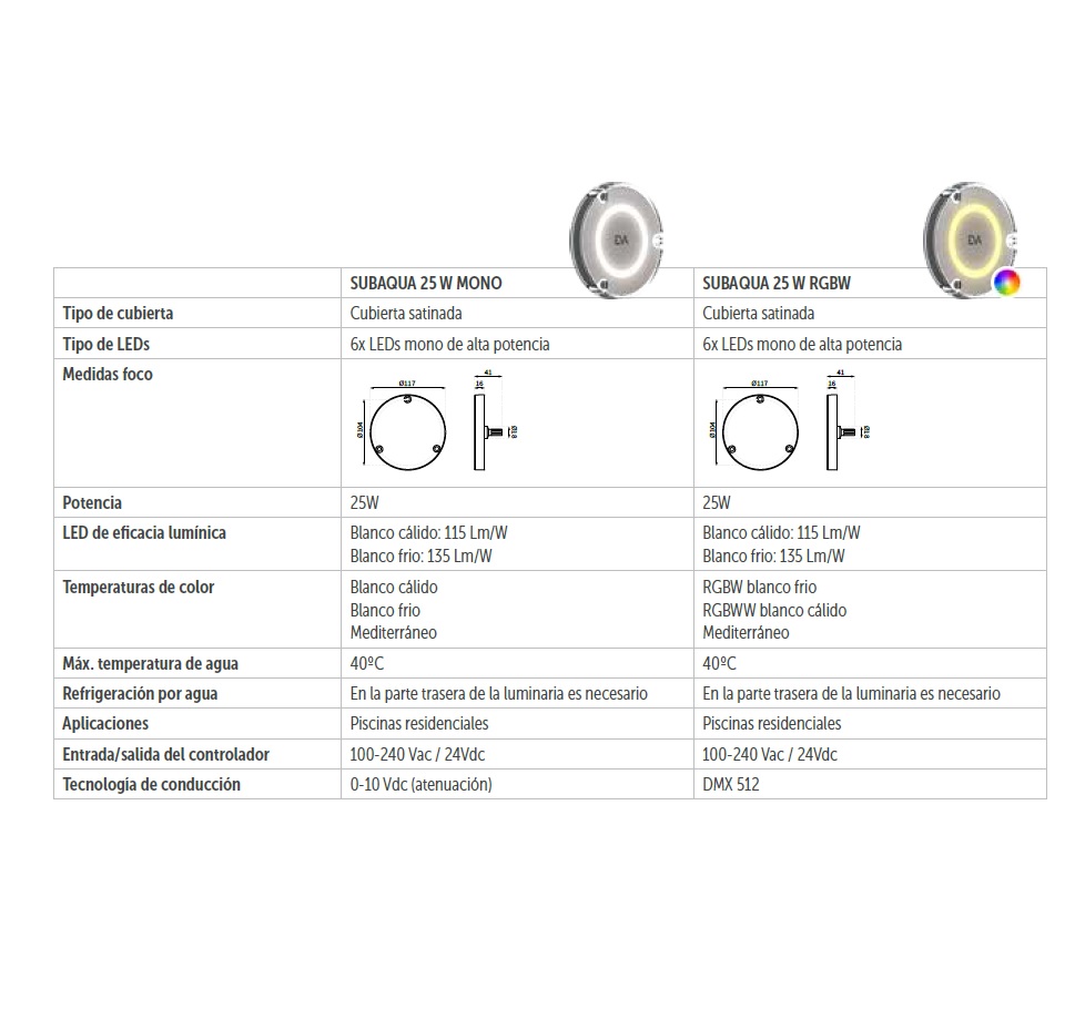 FOCO PISCINA EVA OPTIC SUB AQUA 25W Ø117 MONO BLANCO CÁLIDO CUBIERTA SATINADA 10m