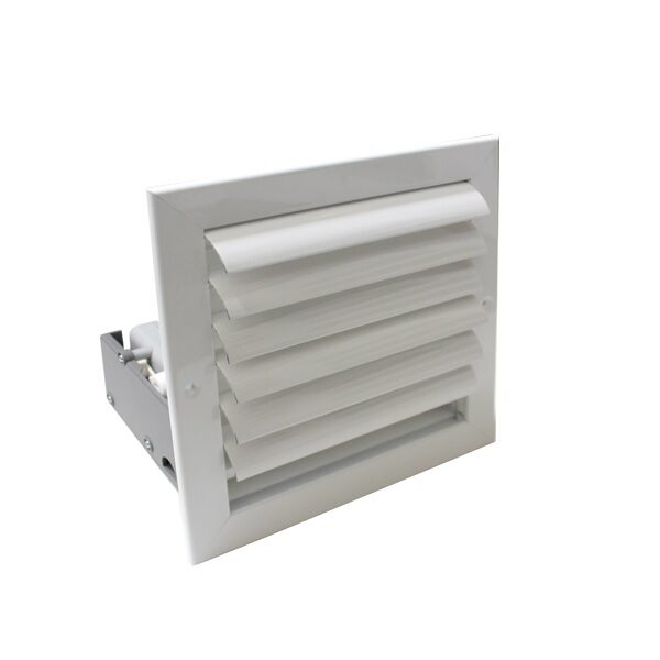 Rejilla Inteligente Doble de aluminio extrusionado con marco estándar de 26 mm, compuesta por: una primera fila de lamas verticales orientables manualmente y una segunda fila de lamas horizontales controladas mediante el conjunto biela-motor. Permite la regulación del caudal necesario para un correcto equilibrado de la red de conductos.