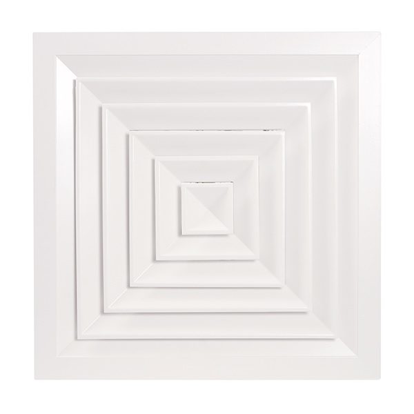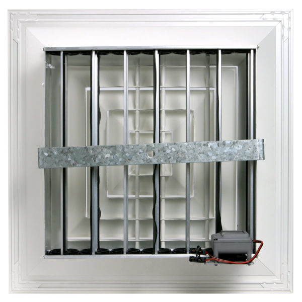 Difusor cuadrado DFCU que controla el paso de aire a la zonaa la que da servicio, mediante compuerta motorizada rectangular anexa al difusor, dependiendo de la demanda térmica de la zona a climatizar.